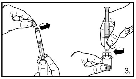 3. Poista esitäytetyn liuotinruiskun kärjen suojus. Kiinnitä ruisku kuiva-ainepulloon kiertämällä se kiinni adapteriin. Ruiskuta sitten kaikki liuotin kuiva-ainepulloon. |
