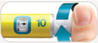 Huom. Jos et pysty kiertämään annosnuppia tai neulasta vuotaa liuosta, et saanut täyttä annosta. Katso ”Tavallisia kysymyksiä” kysymykset 5 ja 9 tämän oppaan luvussa 4.