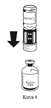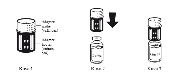 1. Älä käytä valmistetta heti jääkaapista ottamisen jälkeen. Anna liuottimen ja kuiva-aineen lämmetä suljetuissa injektiopulloissa huoneenlämpöisiksi.