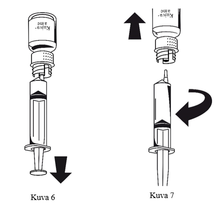 1. Kiinnitä ruisku siirtolaitteen valkoiseen osaan. Käännä pullo ylösalaisin ja vedä liuos ruiskuun (kuva 6).