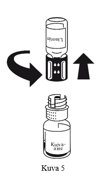 5. Pidä molemmat injektiopullot edelleen kiinni toisissaan ja pyöritä kuiva-ainepulloa varovasti, kunnes valmiste on liuennut.
