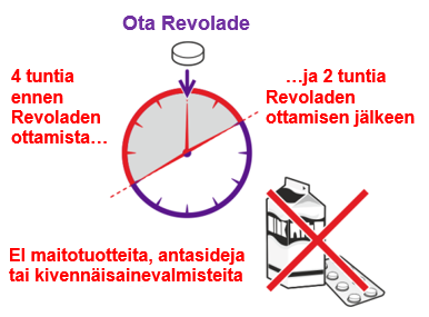 Älä ota Revoladea maidon tai maitotuotteiden kanssa, koska maitotuotteiden sisältämä kalsium heikentää sen imeytymistä. Ks. lisätietoja kohdasta ” Miten Revoladea otetaan ” kohdassa Miten valmistetta käytetään.