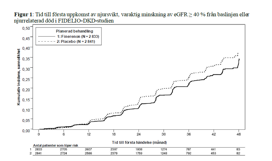 På grund av begränsade kliniska data ska behandling med finerenon avbrytas hos patienter som har progredierat till terminal njursvikt (eGFR < 15 ml/min/1,73 m2) (se avsnitt Varningar och försiktighet).