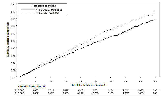 Figur 2:Tid till första uppkomst av kardiovaskulär död, icke-fatal hjärtinfarkt, icke-fatal stroke eller sjukhusinläggning för hjärtsvikt i FIGARO‑DKD-studien