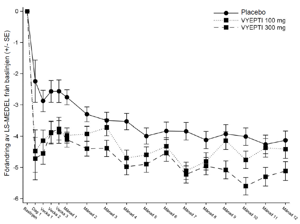 Studien visade att behandling med Vyepti medförde en genomsnittlig minskning av antalet månatliga migrändagar (MMD) under vecka 1–12: -4,8 i Vyepti 100 mg-gruppen och -5,3 i Vyepti 300 mg-gruppen jämfört med -2,1 i placebogruppen, motsvarande en skillnad från placebo på -2,7 dagar (95 % KI: -3,4 till -2,0) respektive -3,2 dagar (95 % KI: -3,9 till -2,5).