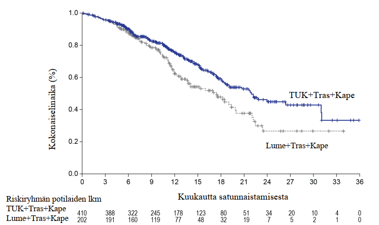 Tutkimussuunnitelman mukaisesti lopullinen kokonaiselinajan analyysi tehtiin noin kahden vuoden kuluttua viimeisen potilaan satunnaistamisesta 370 tapahtuman perusteella. Tämä vastasi 29,6 kuukauden mediaanikestoista seurantaa. Kokonaiselinajan mediaani oli 24,7 kuukautta (95 %:n luottamusväli: 21,6; 28,9) tukatinibia + trastutsumabia + kapesitabiinia saaneiden potilaiden haarassa ja 19,2 kuukautta (95 %:n luottamusväli: 16,4; 21,4) lumelääkettä + trastutsumabia + kapesitabiinia saaneiden potilaiden haarassa (riskisuhde [HR] = 0,725; 95 %:n luottamusväli: 0,585; 0,898). Lopullinen kokonaiselinajan analyysi on esitetty kuvassa 3.