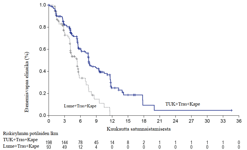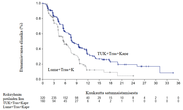 - Ensisijainen PFS-analyysi ensimmäisillä 480 satunnaistetulla potilaalla. PFS perustuu Kaplan-Meier-estimaatteihin.