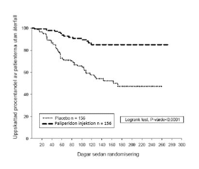Paliperidon injektions effektivitet att upprätthålla symtomkontroll och fördröja återfall av schizofreni fastställdes i en lång, dubbelblind, placebokontrollerad studie med flexibla doser omfattande 849 vuxna patienter (ej äldre) som uppfyllde DSM-IV-kriterierna för schizofreni. I studien ingick en 33 veckor lång, öppen fas av akut behandling och stabilisering, en randomiserad, dubbelblind, placebokontrollerad fas för observation av återfall samt en 52 veckor lång öppen förlängningsperiod. I denna studie gavs paliperidon injektion-doser på 25, 50, 75 och 100 mg månatligen; 75 mg-dosen tilläts endast i den 52 veckor långa öppna förlängningsdelen av studien. Patienterna fick initialt flexibla doser (25-100 mg) av paliperidon injektion under en 9 veckor lång övergångsperiod, vilken följdes av en 24 veckor lång underhållsperiod där patienternas PANSS-poäng skulle vara ≤ 75. Dosjusteringar tilläts endast i de första 12 veckorna av underhållsperioden. Totalt 410 stabiliserade patienter randomiserades till att antingen få paliperidon injektion (genomsnittlig behandlingslängd 171 dagar [intervall 1 dag till 407 dagar]) eller placebo (genomsnittlig behandlingslängd 105 dagar [intervall 8 dagar till 441 dagar]) fram tills de fick ett återfall av schizofrenisymtomen i den dubbelblinda fasen med varierande längd. Prövningen avbröts i förtid på grund av effektskäl eftersom man observerade en signifikant längre tid fram till återfall (p < 0,0001, figur 1) hos patienterna som behandlades med paliperidon injektion jämfört med dem som fick placebo (riskkvot (hazard ratio) = 4,32; 95 % KI: 2,4-7,7).