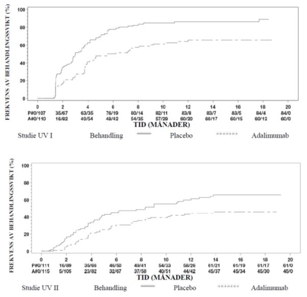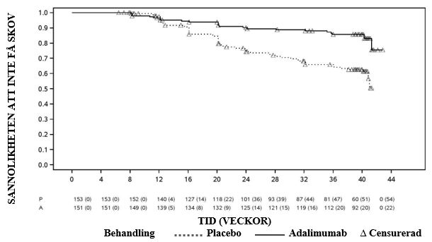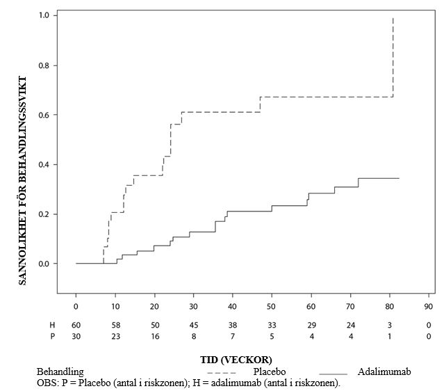 Adalimumab fördröjde signifikant tiden till behandlingssvikt i jämförelse med placebo (se figur 3, P < 0,0001 från log rank test). Mediantiden till behandlingssvikt var 24,1 veckor för patienter som behandlades med placebo, medan mediantiden till behandlingssvikt för patienter som behandlades med adalimumab inte gick att fastställa eftersom mindre än hälften av dessa patienter uppvisade behandlingssvikt. Adalimumab minskade signifikant risken för behandlingssvikt med 75 % jämfört med placebo, vilket framgår av hazardkvoten (HR = 0,25 [95 % CI: 0,12; 0,49]).