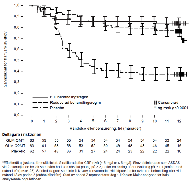 För alla av de ovanstående indikationerna, hos patienter med RA, PsA, AS eller ir-axSpA med en kroppsvikt över 100 kg och som inte får tillräckligt kliniskt svar efter 3 eller 4 doser, kan en ökning av dosen golimumab till 100 mg en gång per månad övervägas om man beaktar den ökade risken för vissa allvarliga biverkningar med 100 mg dosen jämfört med 50 mg dosen (se avsnitt Biverkningar). Fortsatt behandling ska omprövas hos patienter som inte har haft någon positiv effekt av behandlingen efter ytterligare 3‑4 doser på 100 mg.