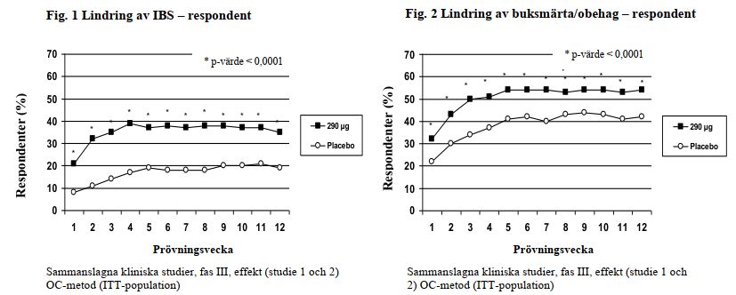 De två primära effektmåtten i båda kliniska studierna var lindring av IBS-symtom och lindring av buksmärta/obehag vid 12 veckor. Kriteriet för lindring av IBS-symtom var avsevärd eller fullständig lindring under minst 50 % av behandlingsperioden. Kriteriet för lindring av buksmärta/obehag var en förbättring på 30 % eller mer under minst 50 % av behandlingsperioden.