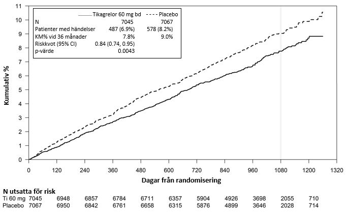 I relation till enbart ASA, reducerade tikagrelor 60 mg två gånger dagligen signifikant det primära sammansatta effektmåttet för kardiovaskulär död, hjärtinfarkt och stroke. Var och en av komponenterna bidrog till reduktionen av det primära sammansatta effektmåttet (kardiovaskulär 17 % RRR, hjärtinfarkt 16 % RRR och stroke 25 % RRR).