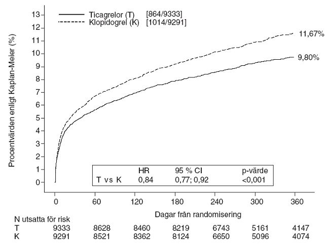 Både regimerna 60 mg två gånger dagligen och 90 mg två gånger dagligen av tikagrelor i kombination med ASA var överlägsna enbart ASA vid preventionen av aterotrombotiska händelser (sammansatt effektmått: kardiovaskulär död, hjärtinfarkt och stroke), med en enhetlig behandlingseffekt över hela studieperioden, vilket gav en RRR på 16 % och en ARR på 1,27 % för tikagrelor 60 mg och en RRR på 15 % och en ARR på 1,19 % för tikagrelor 90 mg.