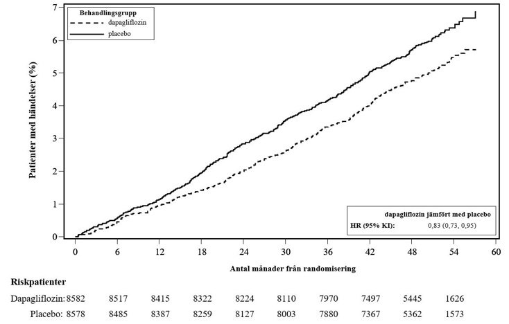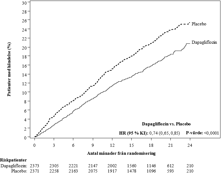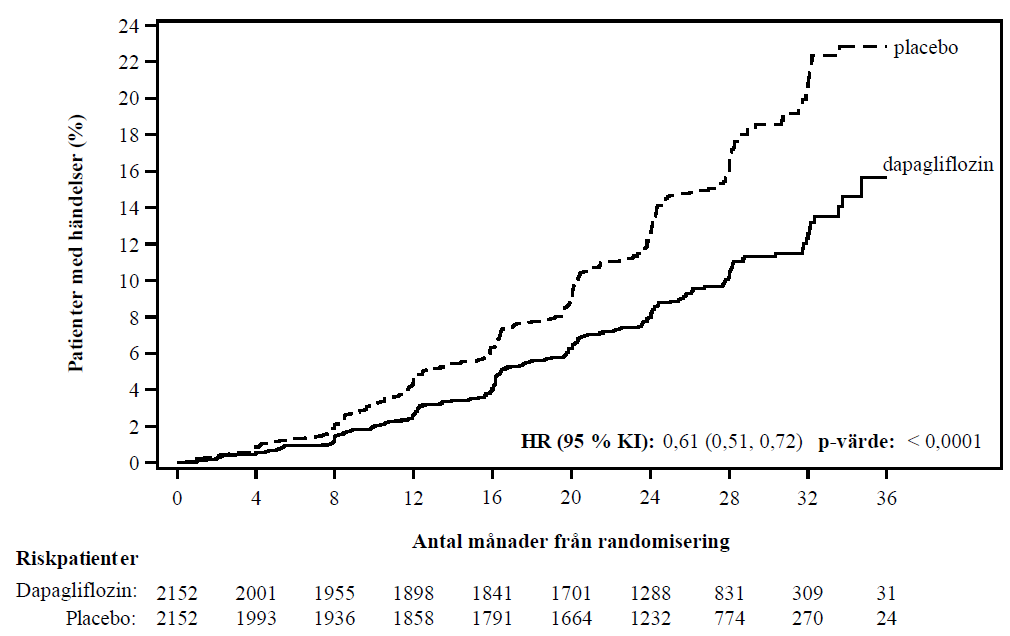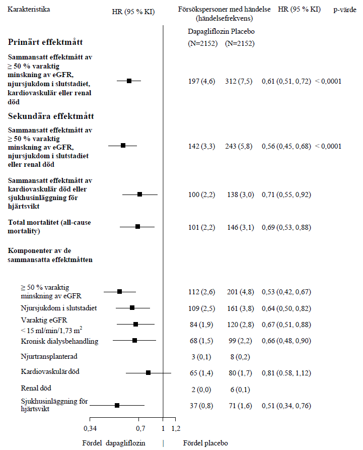 Av 4 304 patienter randomiserades 2 152 till dapagliflozin 10 mg och 2 152 till placebo och följdes upp under en mediantid på 28,5 månader. Behandlingen fortsatte om eGFR föll till nivåer under 25 ml/min/1,73 m2 under studien och kunde fortsätta i de fall dialys behövdes.
