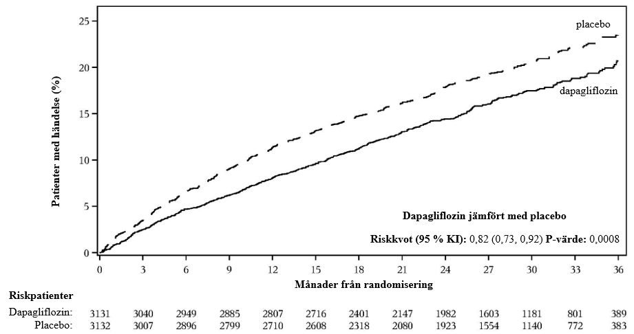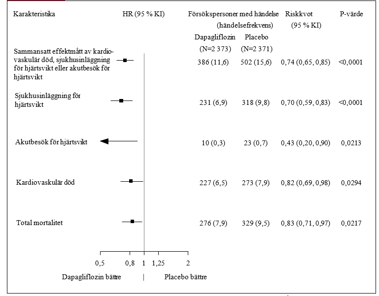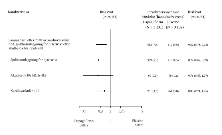 Dapagliflozin var överlägset placebo när det gällde att minska det totala antalet händelser med hjärtsvikt (definierat som första och återkommande sjukhusinläggning för hjärtsvikt eller akutbesök för hjärtsvikt) och kardiovaskulär död; 815 händelser inträffade i dapagliflozingruppen jämfört med 1 057 händelser i placebogruppen (frekvenskvot 0,77 [95 % KI 0,67; 0,89]; p = 0,0003).