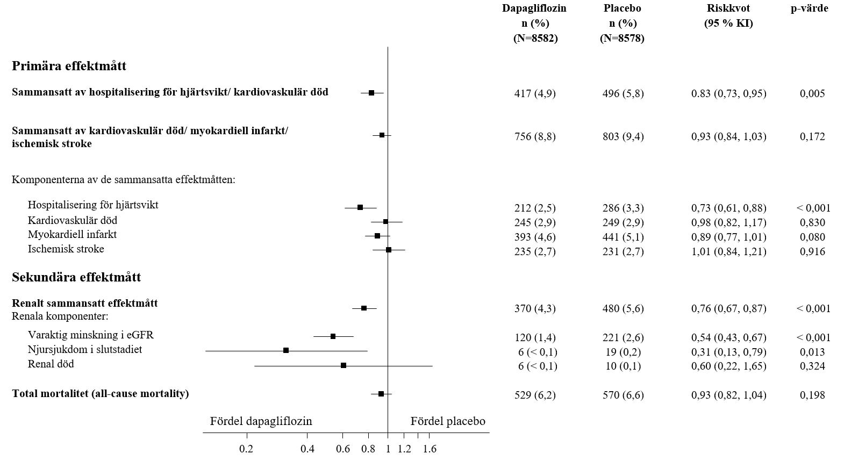 Alla fyra komponenterna i det primära sammansatta effektmåttet bidrog individuellt till behandlingseffekten. Dapagliflozin reducerade även incidensen av det sammansatta effektmåttet bestående av ≥ 50 % varaktig minskning av eGFR, njursjukdom i slutstadiet eller renal död och det sammansatta effektmåttet av kardivaskulär död och sjukhusinläggning för hjärtsvikt. Behandling med dapagliflozin förbättrade total överlevnad hos patienter med kronisk njursjukdom med en signifikant reduktion av total mortalitet (figur 8).
