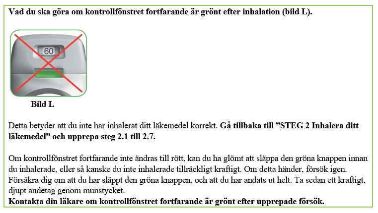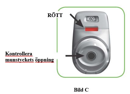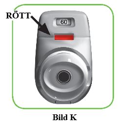 2.7 Kontrollera att kontrollfönstret nu är rött (bild K). Det betyder att du har inhalerat ditt läkemedel korrekt.