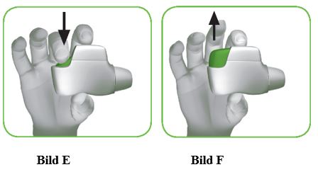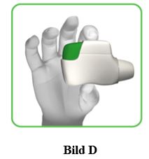 1.3 Håll inhalatorn vågrätt med munstycket mot dig och den gröna knappen uppåt (bild D).
