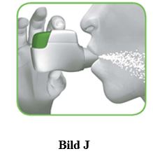 2.1 Håll inhalatorn på avstånd från munnen och andas ut helt. Andas aldrig ut i inhalatorn (bild I).