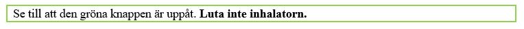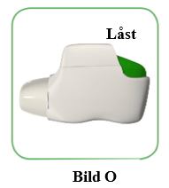 När den gröna knappen inte återgår till sin fullständiga övre position utan är låst i en mellanposition, har du nått den sista dosen (bild O). Även om den gröna knappen är låst, kan du ändå inhalera den sista dosen. Därefter går det inte att använda inhalatorn igen och du ska börja använda en ny inhalator.