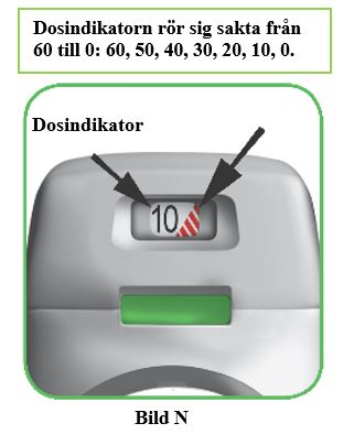- Dosindikatorn visar det totala antalet doser som är kvar i inhalatorn (bild N).