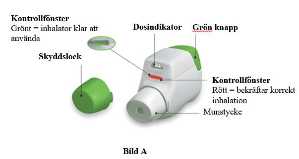 Vitt eller nästan vitt pulver i en vit inhalator med en integrerad dosindikator och en grön doseringsknapp.