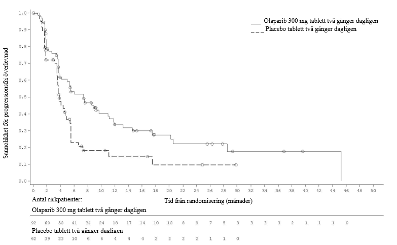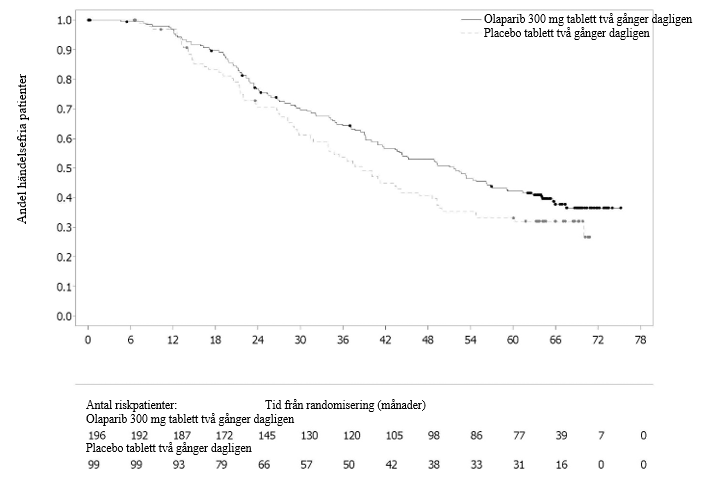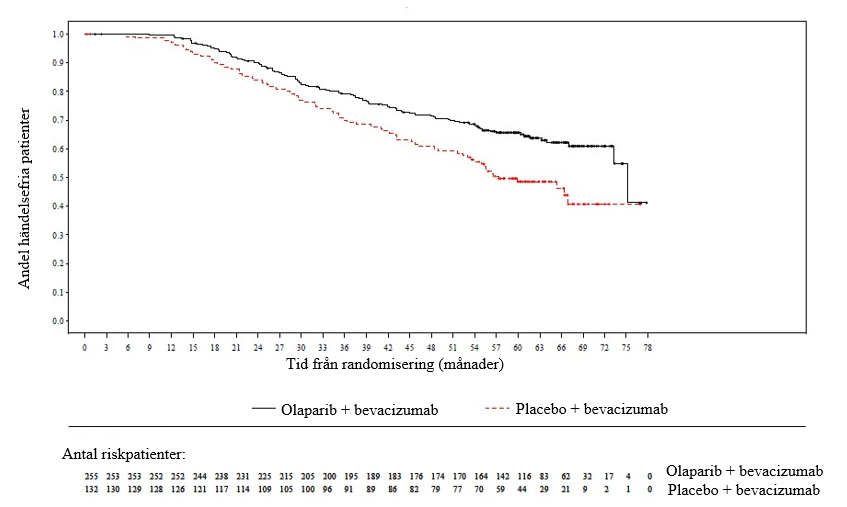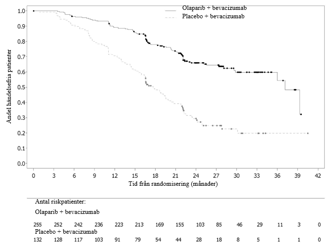 Patienter kan fortsätta behandling med Lynparza till radiologiskt påvisad sjukdomsprogression, oacceptabel toxicitet eller upp till 2 år om inga radiologiska tecken på sjukdom finns efter 2 års behandling. Patienter med tecken på sjukdom vid 2 år, som enligt behandlande läkares bedömning kan dra ytterligare nytta av fortsatt behandling med Lynparza, kan behandlas längre än 2 år. Se produktinformation för bevacizumab för den rekommenderade totala behandlingstiden på högst 15 månader, inklusive perioderna i kombination med cytostatikabehandling och som underhållsbehandling (se avsnitt Farmakodynamiska egenskaper).