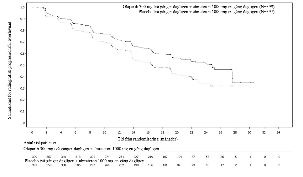Det rekommenderas att behandlingen fortsätter till progress av den underliggande sjukdomen eller till oacceptabel toxicitet vid användning av Lynparza i kombination med abirateron och prednison eller prednisolon. Behandling med en gonadotropinfrisättande hormonanalog (GnRH) ska fortsätta under behandlingen hos alla patienter, alternativt ska patienter ha genomgått en bilateral orkiektomi före behandlingen. Se produktinformationen för abirateron.
