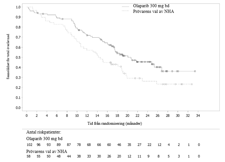 • underhållsbehandling av vuxna patienter med avancerad (FIGO stadie III och IV) höggradig epitelial ovarial-, tubar- eller primär peritonealcancer som är i respons (komplett eller partiell) efter avslutad första linjens platinumbaserad cytostatikabehandling i kombination med bevacizumab och vars cancer är associerad med en positiv status för defekt homolog rekombination (HRD) som definieras antingen av en BRCA1/2-mutation och/eller genomisk instabilitet (se avsnitt Farmakodynamiska egenskaper).