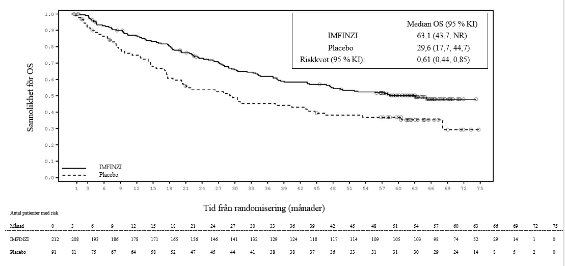 c Patienter med resektabel NSCLC med en kroppsvikt på 30 kg eller lägre måste få viktbaserad dos av IMFINZI (20 mg/kg). I kombination med platinabaserad cytostatikados vid en dos på 20 mg/kg var tredje vecka (21 dagar) före operation, följt av monoterapi vid en dos på 20 mg/kg var fjärde vecka efter operation tills vikten ökar till över 30 kg.