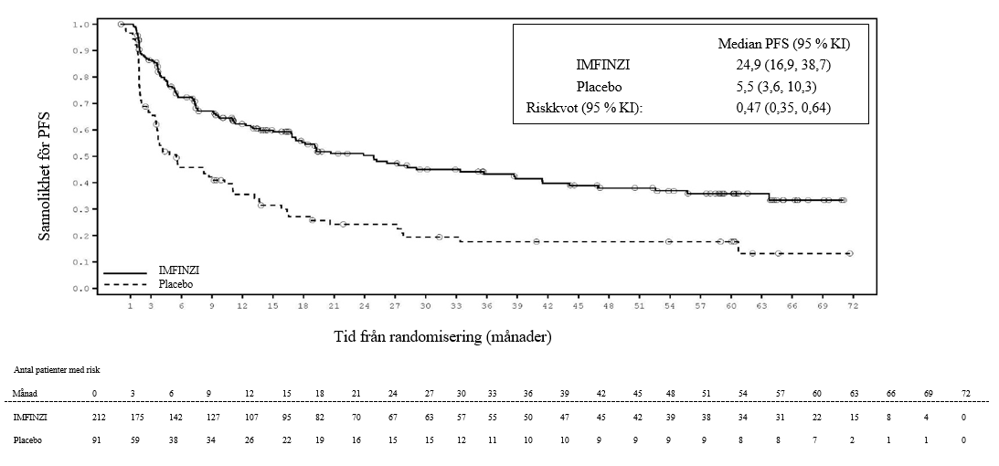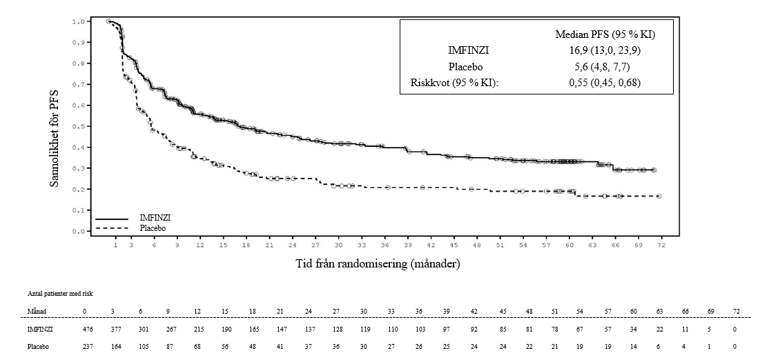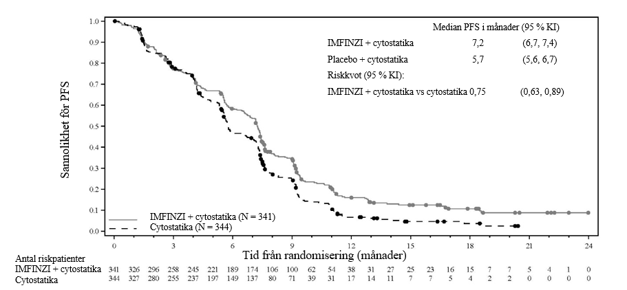 IMFINZI i kombination med platinabaserad cytostatikabehandling som neoadjuvant behandling, följt av IMFINZI som monoterapi som adjuvant behandling, är avsett för behandling av vuxna med resektabel icke-småcellig lungcancer (NSCLC) med hög risk för recidiv och inga EGFR-mutationer eller ALK-rearrangemang (för urvalskriterier, se avsnitt Farmakodynamiska egenskaper).