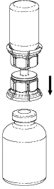 | 4. Ställ flaskan med pulver på ett plant, fast underlag. Vänd vätskeflaskan med det fastsatta Mix2Vial-setet och tryck fast den transparenta adaptern rakt ner på pulverflaskans propp. Vätskan kommer automatiskt att rinna över till pulverflaskan. |