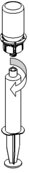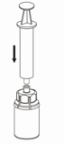 | 7. Dra in luft i en tom, steril spruta. Använd sprutan som medföljer produkten. Medan pulverflaskan står rakt upp kopplas sprutan ihop med Luer-lock inpassningen på Mix2Vial-delen. Spruta in luft i flaskan. |