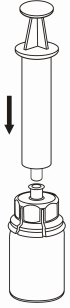 | 8. Medan sprutkolven hålls intryckt, vänd flaskan upp och ned och dra in lösningen i sprutan genom att långsamt föra tillbaka kolven. |