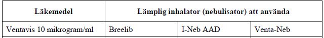 Färdigberedd Ventavis lösning för nebulisator administreras med lämplig inhalator (nebulisator) (se nedan och avsnitt Särskilda anvisningar för destruktion och övrig hantering).