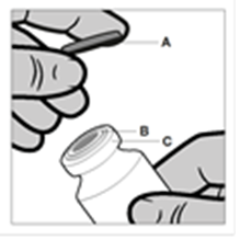 Injektionsflaskan är endast avsedd för engångsbruk. Innehållet i en injektionsflaska ska injiceras intramuskulärt omedelbart efter upptag i sprutan. Ta först bort plastlocket (A) men låt metallringen (B) och membranet (C) sitta kvar.