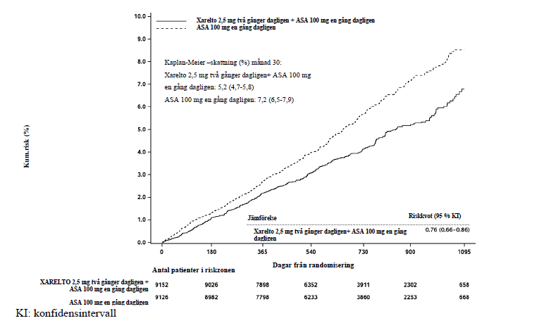 Den primära effektanalysen (d.v.s. dödsorsak oavsett orsak, hjärtinfarkt, eller stroke) visade ingen signifikant statistisk skillnad mellan gruppen som fick rivaroxaban 2,5 mg två gånger dagligen och placebo med riskkvot=0,94 (95 % KI 0,84 – 1,05), p=0.270. För dödsorsakoavsett orsak var det ingen skillnad mellan rivaroxaban och placebo i antal händelser (frekvensen av händelser per 100 patient-år; 11,41 jämfört med 11,63, riskkvot: 0,98; 95 % KI: 0,87 till 1,10; p=0.743). Frekvensen av händelser av hjärtinfarkter per 100 patient-år (rivaroxaban jämfört med placebo) var 2,08 jämfört med 2,52 (riskkvot 0,83; 95 % KI: 0,63 till 1,08; p=0.165) och för stroke var frekvensen av händelser per 100 patient-år 1,08 jämfört med 1,62 (riskkvot: 0,66; 95 % KI: 0,47 till 0,95; p=0,023). Det primära säkerhetsmåttet (d.v.s. blödning med dödlig utgång eller blödning i ett kritiskt organ med risk för permanent funktionsnedsättning), inträffade hos 18 (0,7 %) patienter i gruppen med rivaroxaban 2,5 mg två gånger daglien respektive 23 (0,9 %) av patienterna i placebogruppen (riskkvot=0,80; 95 % KI 0,43 – 1,49; p=0.484). Det var en statistisk signifikant ökning av allvarliga blödningar enligt ISTH-kriterier i rivaroxabangruppen jämfört med placebo (frekvensen av händelser per 100 patient-år: 2,04 jämfört med 1,21, riskkvot 1,68; 95 % KI: 1,18 to 2,39; p=0.003).