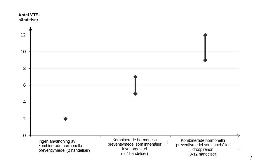 Vid misstänkt eller bekräftad VTE eller ATE ska användning av hormonella preventivmedel avbrytas. Om behandling med antikoagulantia påbörjas ska lämpligt alternativt preventivmedel användas p g a teratogenicitet vid behandling med antikoagulantia (kumariner).