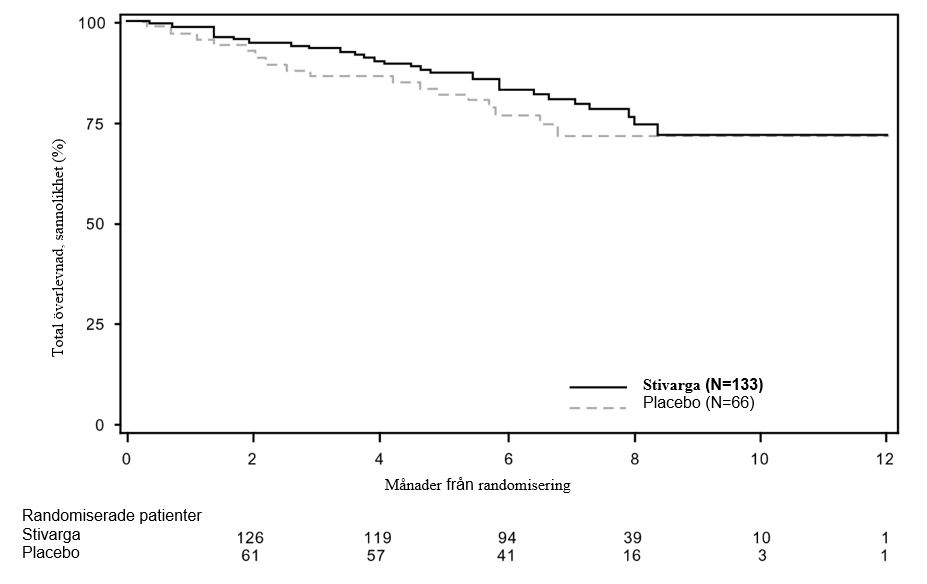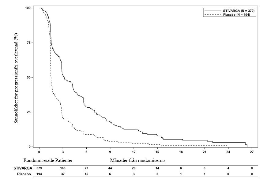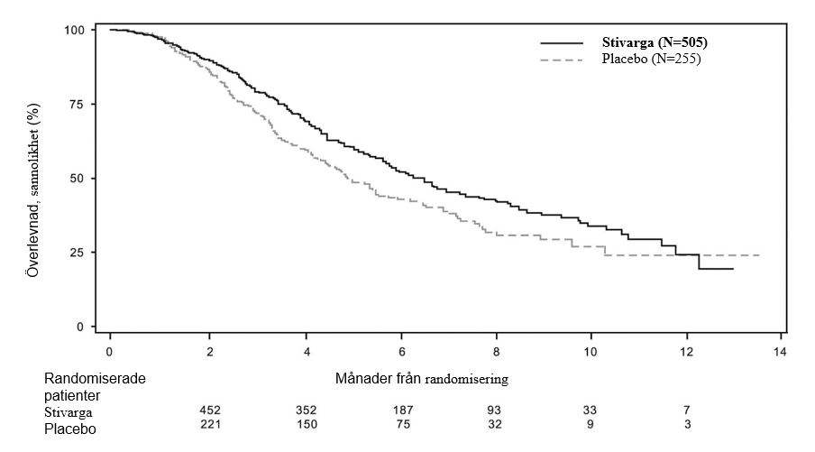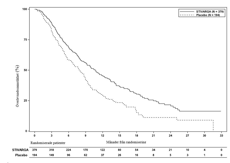 Tillägget av Stivarga till BSC gav en statistiskt signifikant förbättring av OS jämfört med placebo och BSC med en riskkvot på 0,624 [95% KI 0,498, 0,782], p=0,000017 baserat på ett stratifierat log rank-test och en median OS på 10,6 månader jämfört med 7,8 månader (se tabell 7 och figur 4).