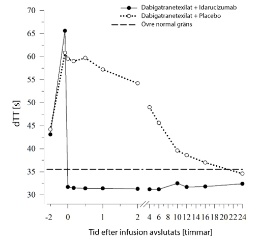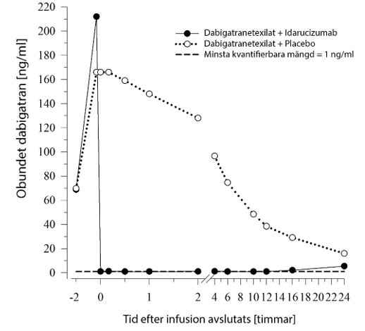 24 timmar efter avslutad infusion av idarucizumab gav förnyad administrering av dabigatranetexilat förväntad antikoagulerande effekt.