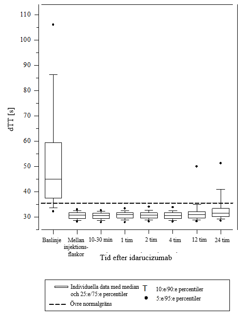 Dabigatran förlänger koagulationstiden för koagulationsmarkörer såsom dTT, TT, aPTT och ECT, vilket ger en ungefärlig indikation på graden av antikoagulation. Ett värde inom det normala intervallet efter administrering av idarucizumab indikerar att patienten inte längre är antikoagulerad. Ett värde över det normala intervallet kan återspegla kvarvarande aktivt dabigatran eller andra kliniska tillstånd (t.ex. närvaro av andra aktiva substanser eller transfusionskoagulopati). Dessa tester användes för att utvärdera dabigatrans antikoagulerande effekt. En fullständig och ihållande reversering av dabigatraninducerad förlängd koagulationstid observerades omedelbart efter idarucizumabinfusion, och varade under hela observationstiden på minst 24 timmar.