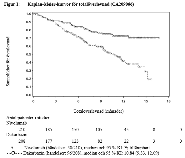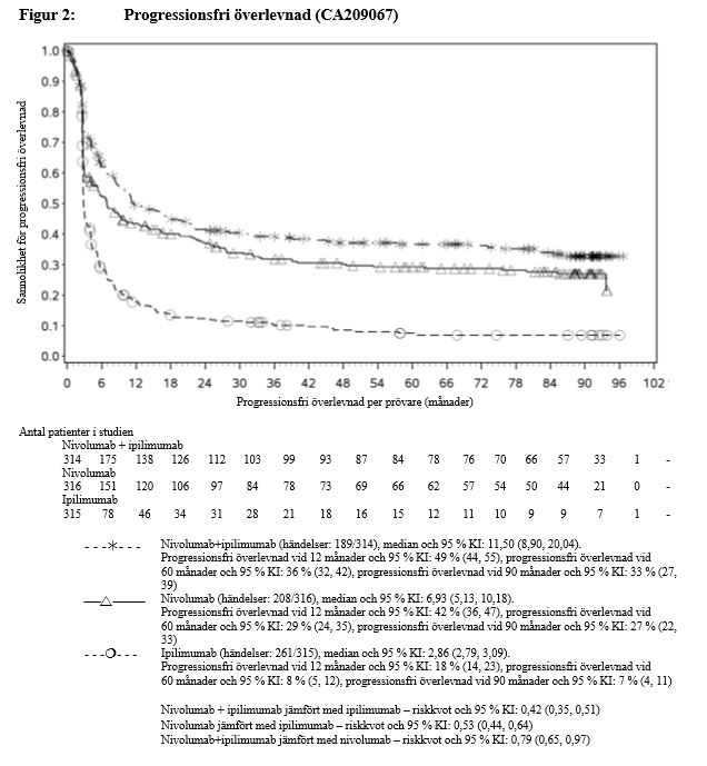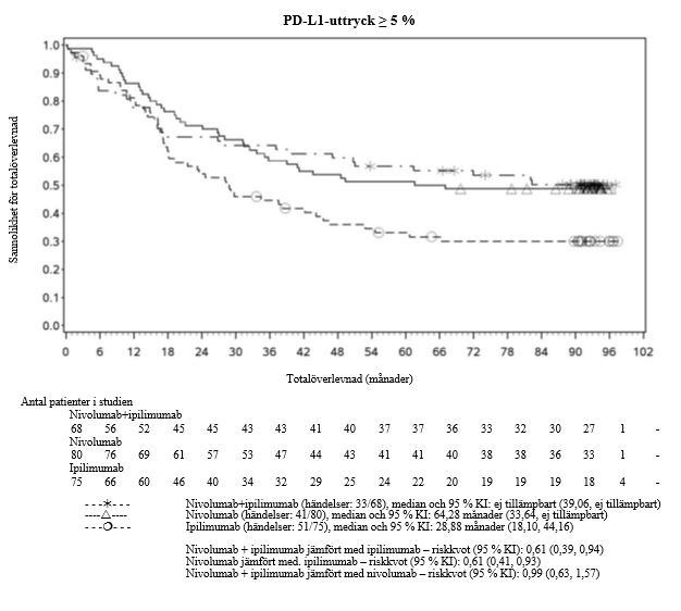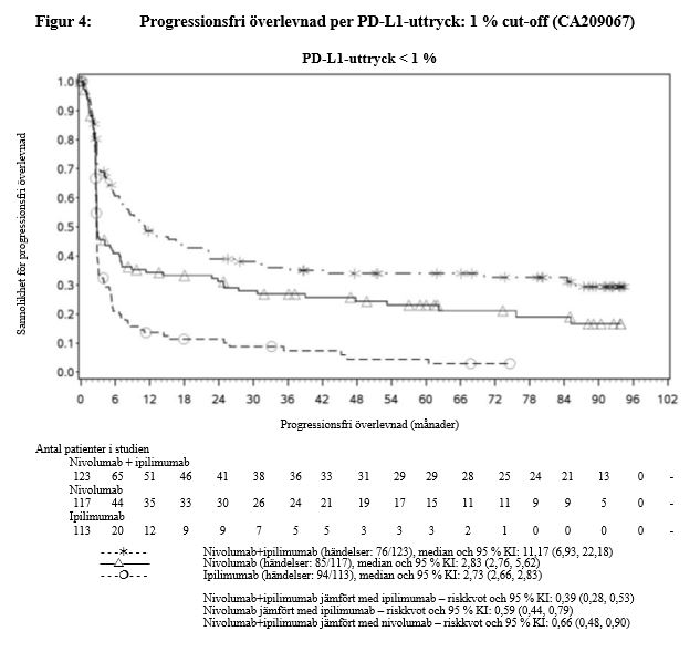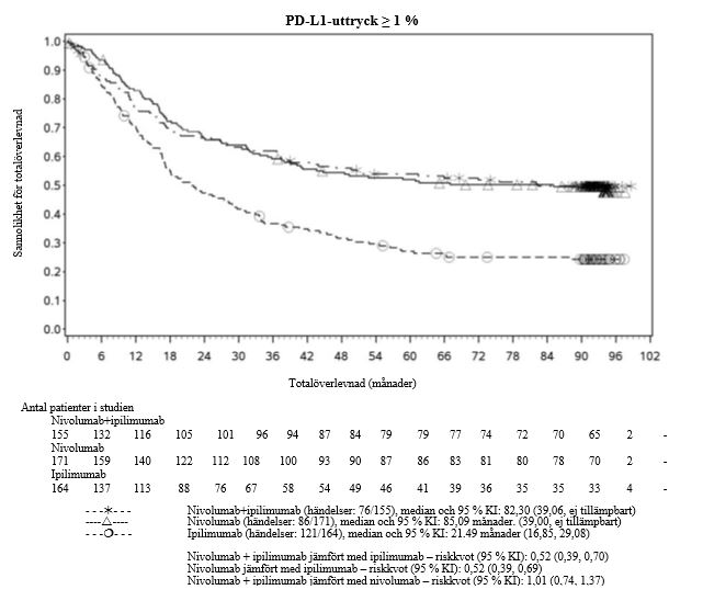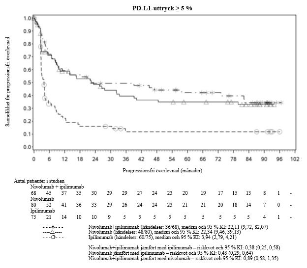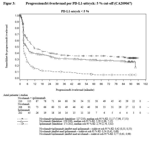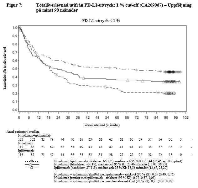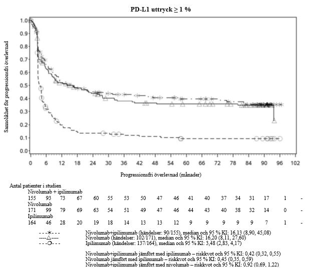 Jämfört med nivolumab monoterapi har en ökning av progressionsfri överlevnad (PFS) och totalöverlevnad (OS) med kombinationen nivolumab och ipilimumab endast visats hos patienter med lågt tumöruttryck av PD-L1 (se avsnitt Varningar och försiktighet och Farmakodynamiska egenskaper)