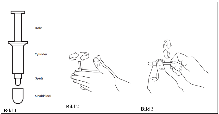 3) Vrid kolven fram och tillbaka flera gånger så att du försäkrar dig om att den kommer glida lätt (se bild 3). Ta sedan av locket från endosbehållarens spets.