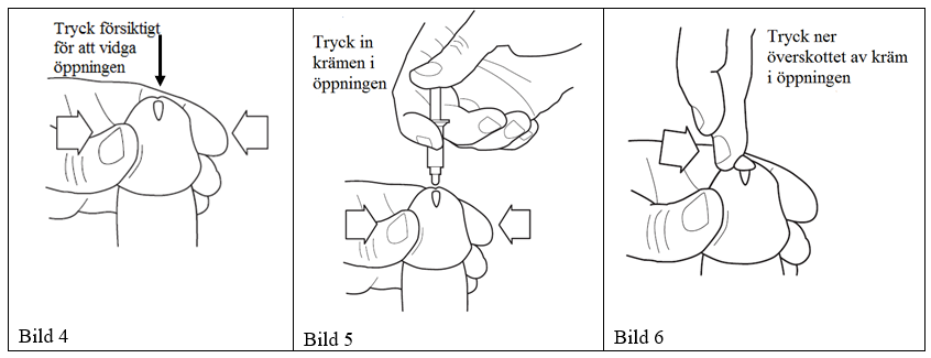 5) Håll endosbehållarens cylinder mellan fingrarna och placera behållarens spets så nära penisöppningen som möjligt, utan att sticka in den i penis (se bild 5) så att krämen kan tryckas ner i urinröret. Kom ihåg att trycka ut all kräm från endosbehållaren. Tryck försiktigt och långsamt men bestämt ned kolven med tummen eller fingret, tills all kräm tryckts in i penisöppningen och ner i urinröret. Observera: Även om det är viktigt att all kräm kommer ner i urinröret ska inte endosbehållarens spets föras in i penisöppningen.