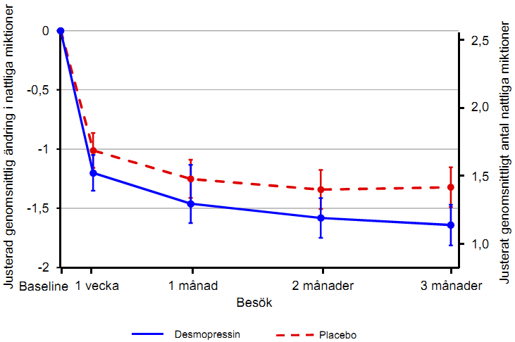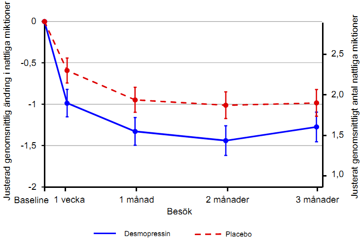 Båda studierna uppfyllde de 2 co-primära endpoints med statistiskt signifikant skillnad i desmopressins favör under 3-månadersperioden. Statistisk signifikant minskning visades av det justerade genomsnittliga antalet nattliga miktioner från utgångsvärdet med 25 mikrogram desmopressin frystorkade tabletter (-1,46) jämfört med placebo (-1,24) i studien med kvinnor (p = 0,028) (figur 1) och med 50 mikrogram desmopressin frystorkade tabletter (-1,25) jämfört med placebo (-0,88) i studien med män (p = 0,0003) (figur 2). Proportionen försökspersoner med > 33 % minskning av det genomsnittliga antalet nattliga miktioner (respondenter) ökade signifikant, nästan en dubblering. Oddskvoten för > 33 % minskning med 25 mikrogram desmopressin frystorkade tabletter jämfört med placebo var 1,85 (p = 0,006) i studien med kvinnor och oddskvoten för > 33 % minskning med 50 mikrogram desmopressin frystorkade tabletter jämfört med placebo var 1,98 (p = 0,0009) i studien med män.