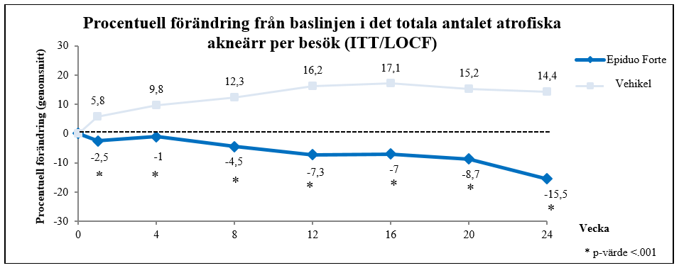 Figur 1 visar den procentuella förändringen av det totala antalet atrofiska ärr per besök på ansiktshalvorna som fått Epiduo 0,3 % / 2,5 % gel respektive vehikel.