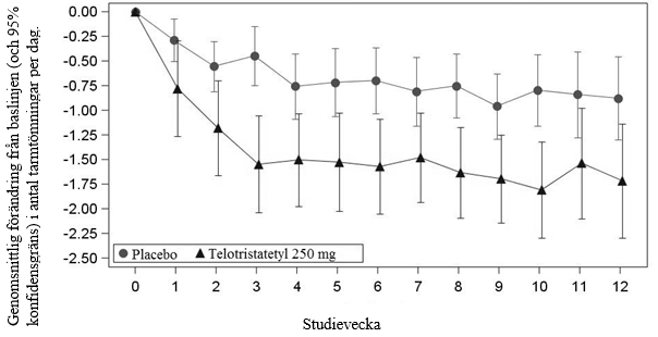 En studie som undersökte effekten av kortverkande oktreotid (3 doser på 200 mikrogram injicerat subkutant med 8 timmars mellanrum) på farmakokinetiken av en engångsdos av telotristatetyl 500 mg hos friska försökspersoner, visade en minskning av geometriskt medelvärde Cmax och AUC0-tlast på 86% respektive 81%, för telotristatetyl (se avsnitt Interaktioner). Minskad exponering observerades inte i en dubbelblind, placebokontrollerad, randomiserad multicenterstudie på 12 veckor hos vuxna patienter med karcinoidsyndrom på långverkande somatostatinanalogbehandling.