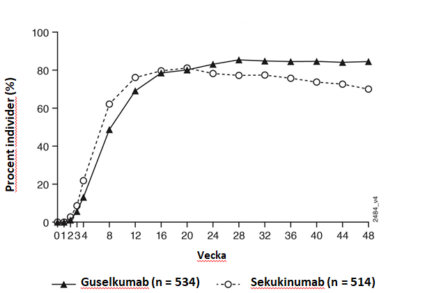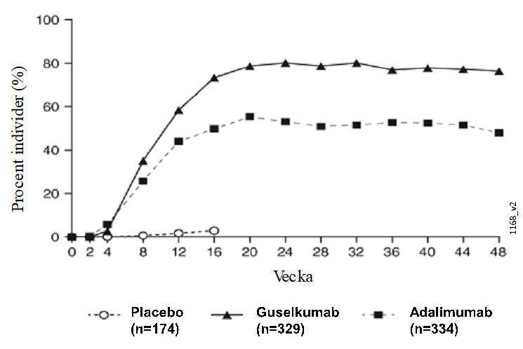 d Ytterligare 8 patienter i gruppen som fick placebo och 17 patienter i gruppen som fick guselkumab 400 mg subkutant exponerades tidigare för, men sviktade inte, på en biologisk behandling.