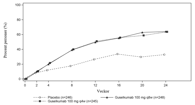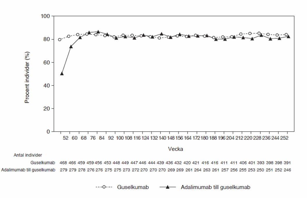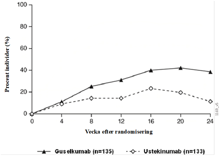 Klinisk remission vid vecka 24 uppnåddes av en signifikant större andel patienter som behandlades med guselkumab 400 mg subkutan induktion följt av guselkumab 100 mg subkutant var 8:e vecka eller 200 mg subkutant var 4:e vecka jämfört med placebo (60,9 % respektive 58,3 % mot 21,4 %, båda p‑värdena < 0,001). Klinisk remission vid vecka 48 uppnåddes av 60 % respektive 66,1 % av patienterna som behandlades med guselkumab 400 mg subkutan induktion följt av guselkumab 100 mg subkutant var 8:e vecka eller 200 mg subkutant var 4:e vecka (båda p-värdena < 0,001 jämfört med placebo).