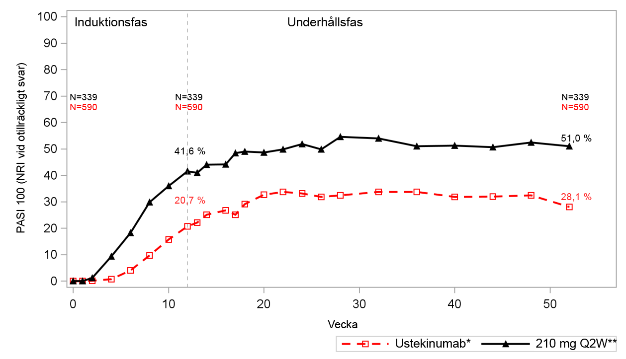 Q2W = varannan vecka PSI = Psoriasis Symptom Inventory. PSI-responder: total poäng ≤ 8 och inga objektpoäng > 1, SD: standardavvikelse. Patienter för vilka data saknas räknades som icke-responders. På grund av återrandomiseringen till andra undersökta dosregimer är n-i underhållsfasen betydligt lägre än n-randomiserad i flera armar. Underhållsfasen i AMAGINE-2 och -3 innefattade inte placebo. *p-värde jämfört med motsvarande placebo, justerat för stratifieringsfaktorer < 0,001 |